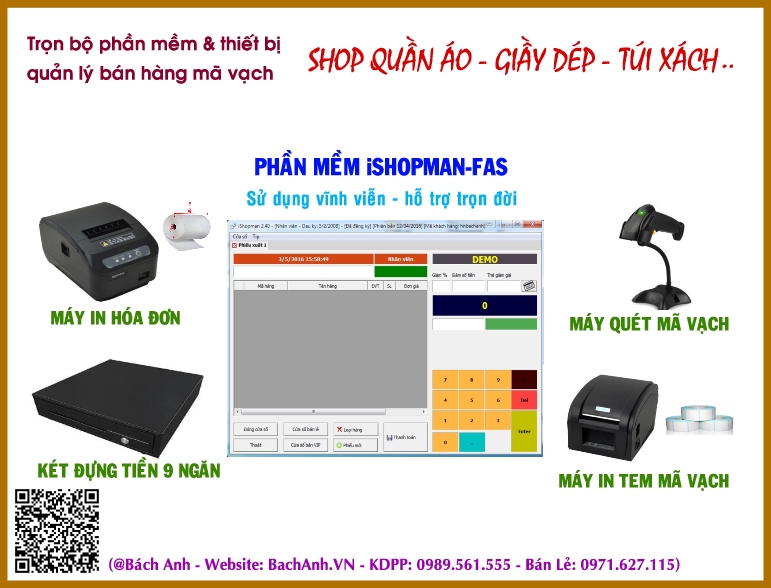 Mô hình hoạt động: (1) nhập hàng và giá, size, màu vào phần mềm iShopmanFAS; giá có thể chỉnh sửa theo nhu cầu -> (2) in tem nhãn mã vạch tên hàng kèm giá, có thể theo size/màu hay lô bịch và dán lên sản phẩm (3) tại quầy xuất bán dùng máy quét mã vạch lia sản phẩm ra đơn giá thành tiền