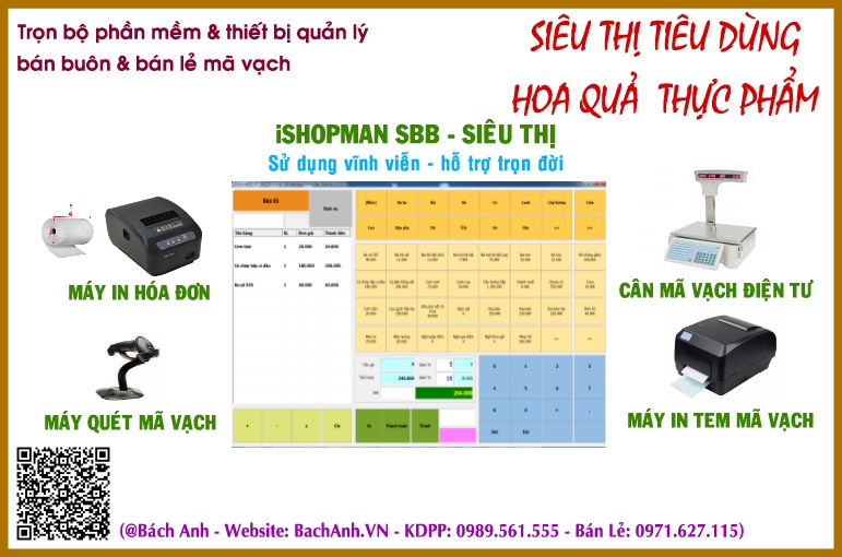 Mô hình hoạt động: (1) quét hàng hoặc sử dụng mẫu dữ liệu có sẵn vào phần mềm iShopmanSBB -> (2) một số ít hàng chưa có sẵn mã vạch thì in tem dán lên -> (3) tại quầy thu ngân quét hàng vào bằng máy quét mã vạch -> (4) ra hóa đơn thu tiền (két nếu có tự mở khi xuất hóa đơn)