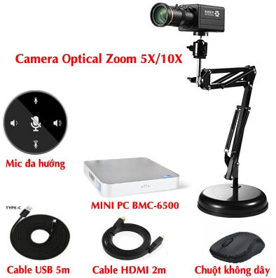 Bộ thiết bị cơ bản gồm: 01 Webcam 2K autofocus/wide angle; 01 míc thu âm đa hướng có nút bật/tắt có đèn LED; 01 dây USB-Type C 5m; 01 bộ MiniPC; 01 cable HDMI